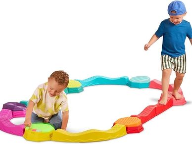 Step into musical active play with the Balance & Groove Set from B. toys! This innovative balance beam toy features wavy beams, curved sections, and a special guest star: a glowing musical stepping stone! This colorful active playset lets kids create endless combinations with the wavy beams and sensory stepping stones – it's even easy enough for them to take lead. But that's not all! The musical stepping stone also features three exciting musical games: Freeze Dance, Hop-to-It!, and Dance Party! As kids play, they'll develop gross motor skills and coordination while staying active and creative. The set's tactile surfaces promote sensory development, and the musical games are great for solo play or group fun. All the pieces stack neatly for easy storage, and this set is great for indoor or outdoor play. 4 x AA batteries are required and included. Recommended for ages 3 and up.